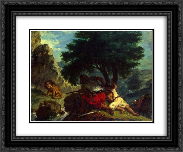 Lion Hunt in Morocco 24x20 Black Ornate Wood Framed Art Print Poster with Double Matting by Delacroix, Eugene