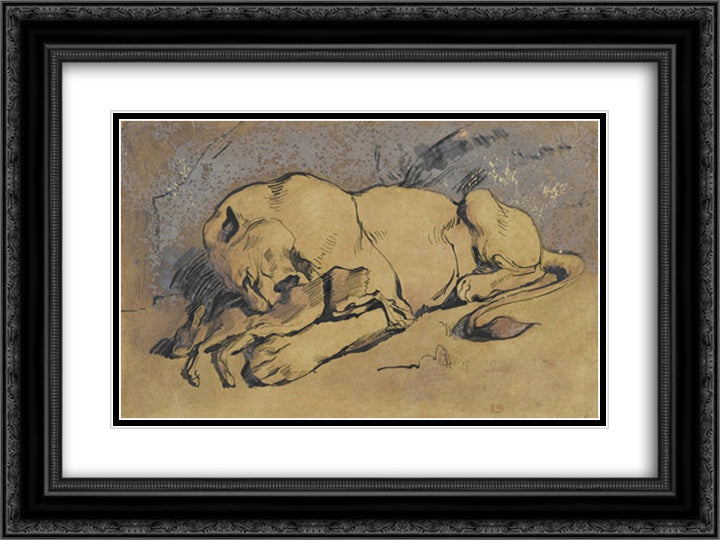 Lioness devouring a Rabbit 24x18 Black Ornate Wood Framed Art Print Poster with Double Matting by Delacroix, Eugene