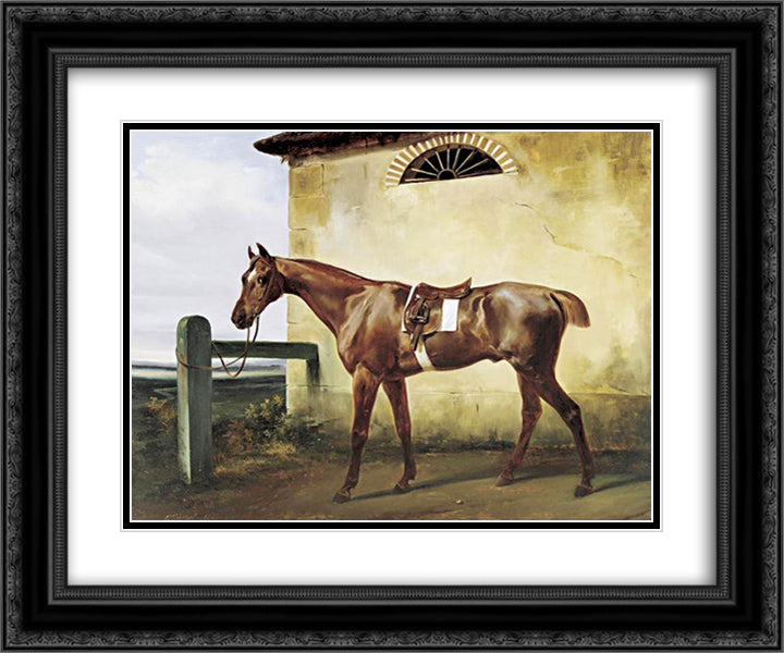 A Saddled Race Horse Tied to a Fence 24x20 Black Ornate Wood Framed Art Print Poster with Double Matting by Vernet, Horace