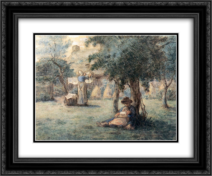 Woman Hanging Her Laundry 24x20 Black Ornate Wood Framed Art Print Poster with Double Matting by Millet, Jean Francois