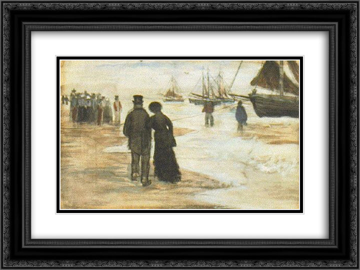 Beach with People Walking and Boats 24x18 Black Ornate Wood Framed Art Print Poster with Double Matting by Van Gogh, Vincent