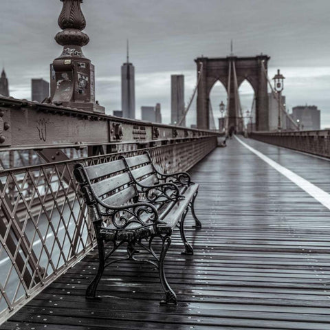 Empty bench on the pedestrian walkway of the Brooklyn Bridge, New York Black Modern Wood Framed Art Print with Double Matting by Frank, Assaf