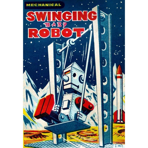 Swinging Baby Robot Black Modern Wood Framed Art Print with Double Matting by Retrobot