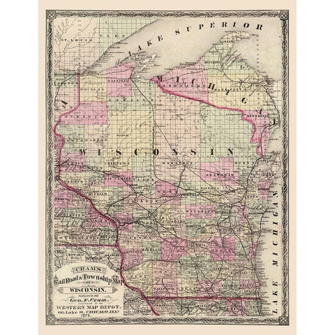 Wisconsin Railroads and Townships - Cram 1875 Black Modern Wood Framed Art Print with Double Matting by Cram