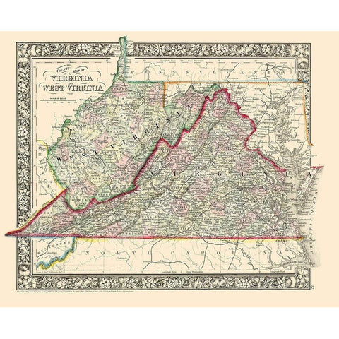 Virginia, West Virginia Counties - Mitchell 1863 Gold Ornate Wood Framed Art Print with Double Matting by Mitchell