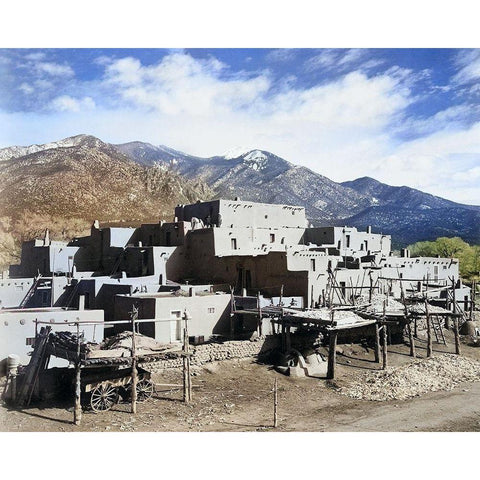 Full view of city-mountains in background-Taos Pueblo National Historic Landmark Color Gold Ornate Wood Framed Art Print with Double Matting by Adams, Ansel