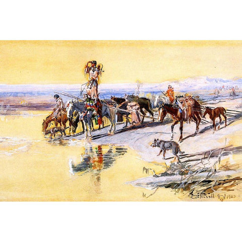 Indians Traveling on Travois Gold Ornate Wood Framed Art Print with Double Matting by Russell, Charles Marion