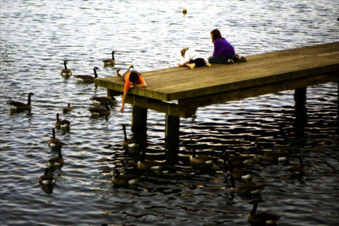 Feeding the Geese III White Modern Wood Framed Art Print with Double Matting by Hausenflock, Alan
