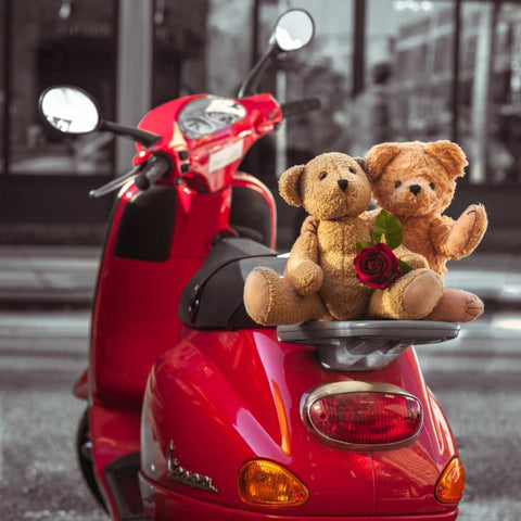 Teddy bears with red rose on a scooter, New York White Modern Wood Framed Art Print with Double Matting by Frank, Assaf