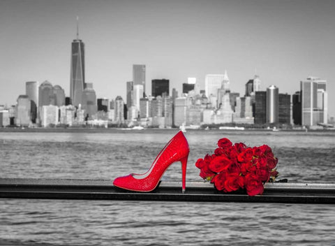 High heel shoe with bunch of roses against Lower manhattan skyline, New York White Modern Wood Framed Art Print with Double Matting by Frank, Assaf