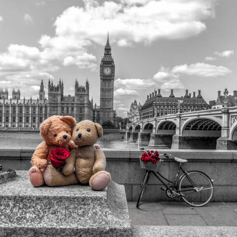 Teddy Bears with red rose agasint Westminster Abby, London, UK White Modern Wood Framed Art Print with Double Matting by Frank, Assaf