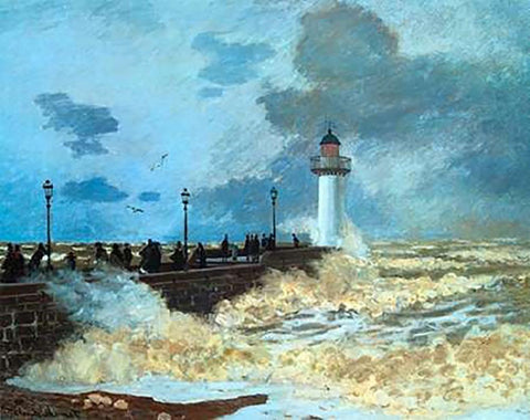 La Jettee Du Harvre White Modern Wood Framed Art Print with Double Matting by Monet, Claude