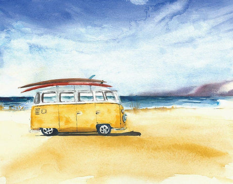 Yellow Minivan with Surfboards White Modern Wood Framed Art Print with Double Matting by Anonymous