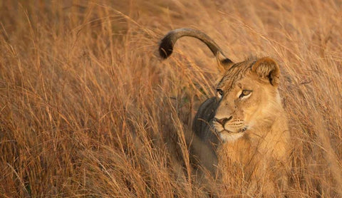 Lion in Tall Grass White Modern Wood Framed Art Print with Double Matting by Bennion, Scott