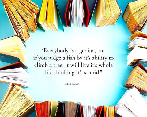 Albert Einstein Quote: Everybody is a Genius White Modern Wood Framed Art Print with Double Matting by ArtsyQuotes