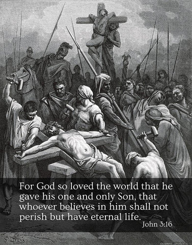 Bible Verse Quote John 3:16, Gustave Dore - Crucifixion of Jesus White Modern Wood Framed Art Print with Double Matting by ArtsyQuotes