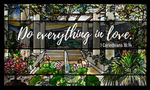 Bible Verse Quote 1 Corinthians 16:14, Louis Comfort Tiffany - Garden Landscape Window White Modern Wood Framed Art Print with Double Matting by ArtsyQuotes