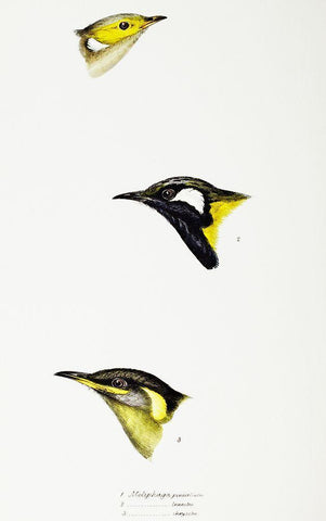White-plumed Honeyeater-White-eared Honeyeater and Yellow-eared Honeyeater White Modern Wood Framed Art Print with Double Matting by Gould, John