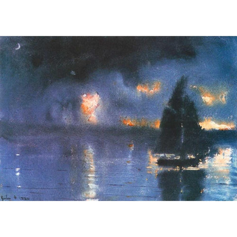 Sailboat And Fourth Of July Fireworks Black Modern Wood Framed Art Print by Homer, Winslow