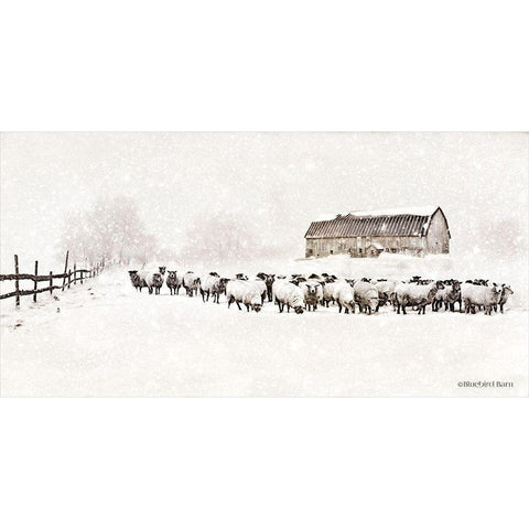 Warm Winter Barn with Sheep Herd Black Modern Wood Framed Art Print by Bluebird Barn