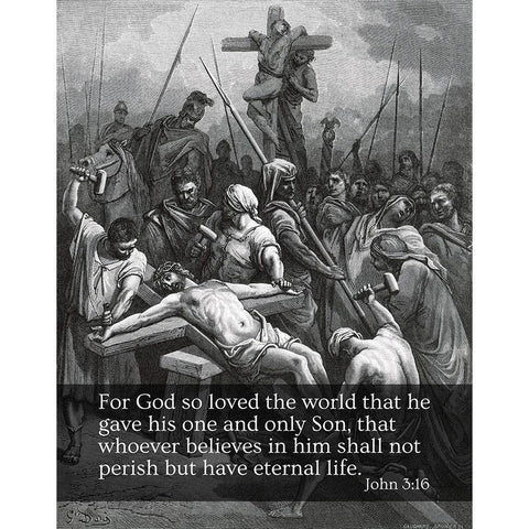 Bible Verse Quote John 3:16, Gustave Dore - Crucifixion of Jesus Black Modern Wood Framed Art Print by ArtsyQuotes