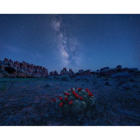 Milky Way Over Blooming Cactus In Needles District White Modern Wood Framed Art Print by Xu, Mei