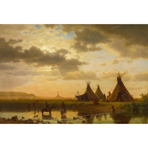 View of Chimney Rock, Ohalilah Sioux Village in the foreground White Modern Wood Framed Art Print by Bierstadt, Albert